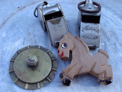 So in honour of all things 'vintage & jewellery', my first pic shows the four items purchased at the market today....Two YUMMY tarnished metal whistles (the patina on each of these is to DIE for just quietly) & an exceptionally NEAT brass disc that I initially thought was a lid....The vendor I bought this piece from explained to me that the knob actually turns to reveal small pins that were used for creating a similar wool craft to 'french knitting'....!!! This is going to make a GREAT centerpiece in a necklace....!!!